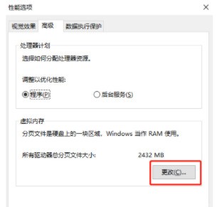 ②打開【性能選項】對話框,選擇【高級】→【更改】,打開【虛擬內(nèi)存】設(shè)置