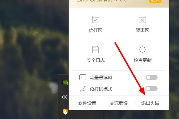 1,以火絨安全軟件為例,首先,在電腦右下角的托盤中,找到安全軟件的圖標,右鍵點擊。在彈出的菜單中選擇“退出”一項。