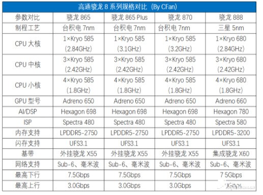 驍龍870就是驍龍865Plus的再度超頻版,它依舊采用基于Cortex-A77架構(gòu)魔改而來的Kryo585核心以及“1+3+4”的三叢集方案,只是將超大核的主頻提升到了3.2GHz(還有3.19GHz一說),從而超越了麒麟9000的3.13GHz,成為了史上主頻最高的手機(jī)專用SoC。與此同時,驍龍870的GPU頻率也有所提升(具體頻率未知),所以它將具備更強(qiáng)的理論性能。從早前曝光的一張疑似驍龍870的Geekbench5跑分圖來看,驍龍870的分?jǐn)?shù)遠(yuǎn)超標(biāo)準(zhǔn)版的驍龍865,已經(jīng)無限接近最新的驍龍888了。