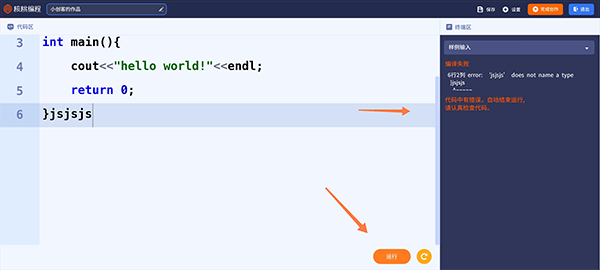 5、隨后就可以進入代碼程序自己編輯,編輯完成點擊運行,如果編輯錯誤就會顯示編譯失敗,顯示哪一行弄錯了自己修改就行了